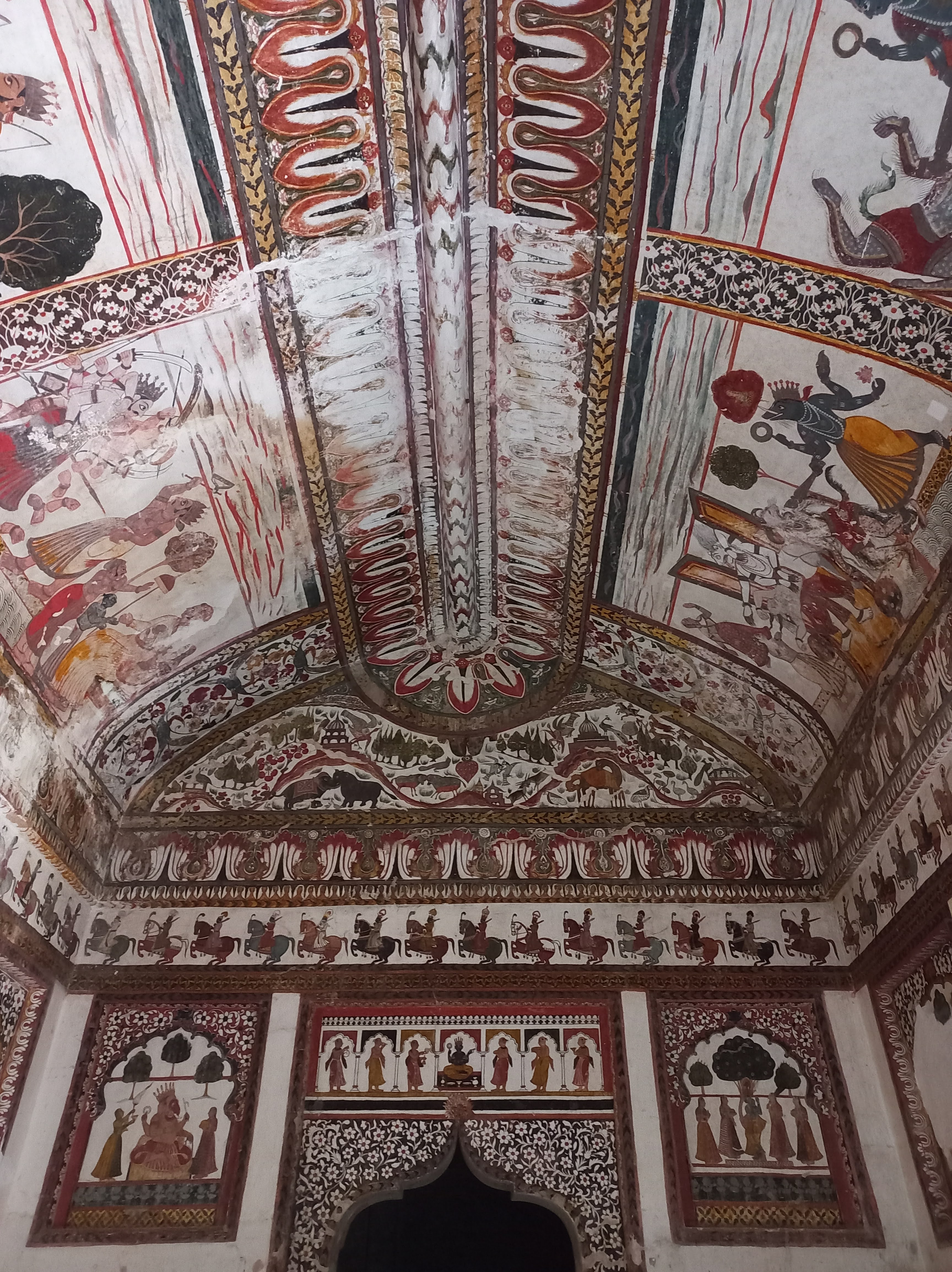 Dashavathara images adorn the walls of both the king’s and queen’s quarters. It is interesting to note that while the queen’s room has scenes from Ramavathara, the king’s room has scenes from Krishnavathara. Though the painting and murals are all dedicated to Hinduism, the style itself is Mughal – a sign of how much each culture influenced the other.