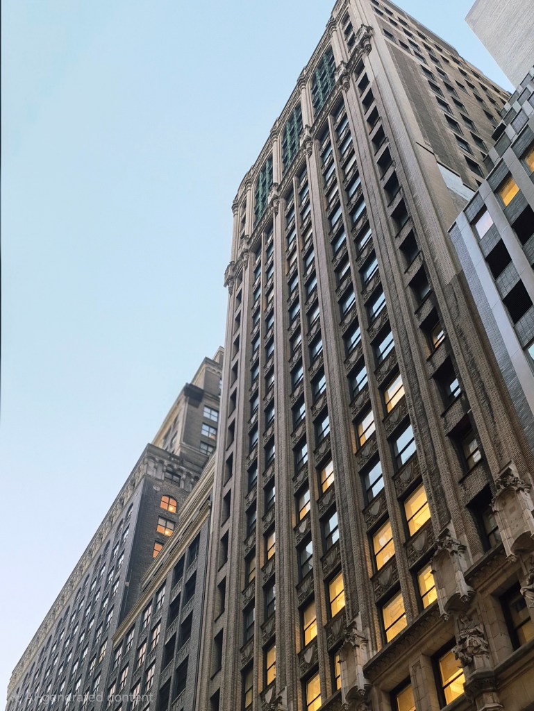 Between the subways and the walks, there are the buildings. Miles high and touching the sky, old and new, built next to each other without a hair’s breadth space between them, they give the city its iconic skyline. Beyond the famous Empire State, Chrysler, Vanderbilt & Rockefeller, there are many nameless, familiar buildings that always manage to catch one’s eye. You might spot a beautifully aged-brick tower next to an imposing wall of cement & glass – both equally striking. In all honesty, I had fully expected to dislike the concrete-park aspect of the city. I did not. With a neck always craned to spot as many of the delightful Art Deco elements I could, I happily walked the streets, always distracted. I will always remember my strolls in Greenwich for the constantly charming building (be it tens of stories tall or even the modest 4 storey residential apartment) it threw out for me to admire.